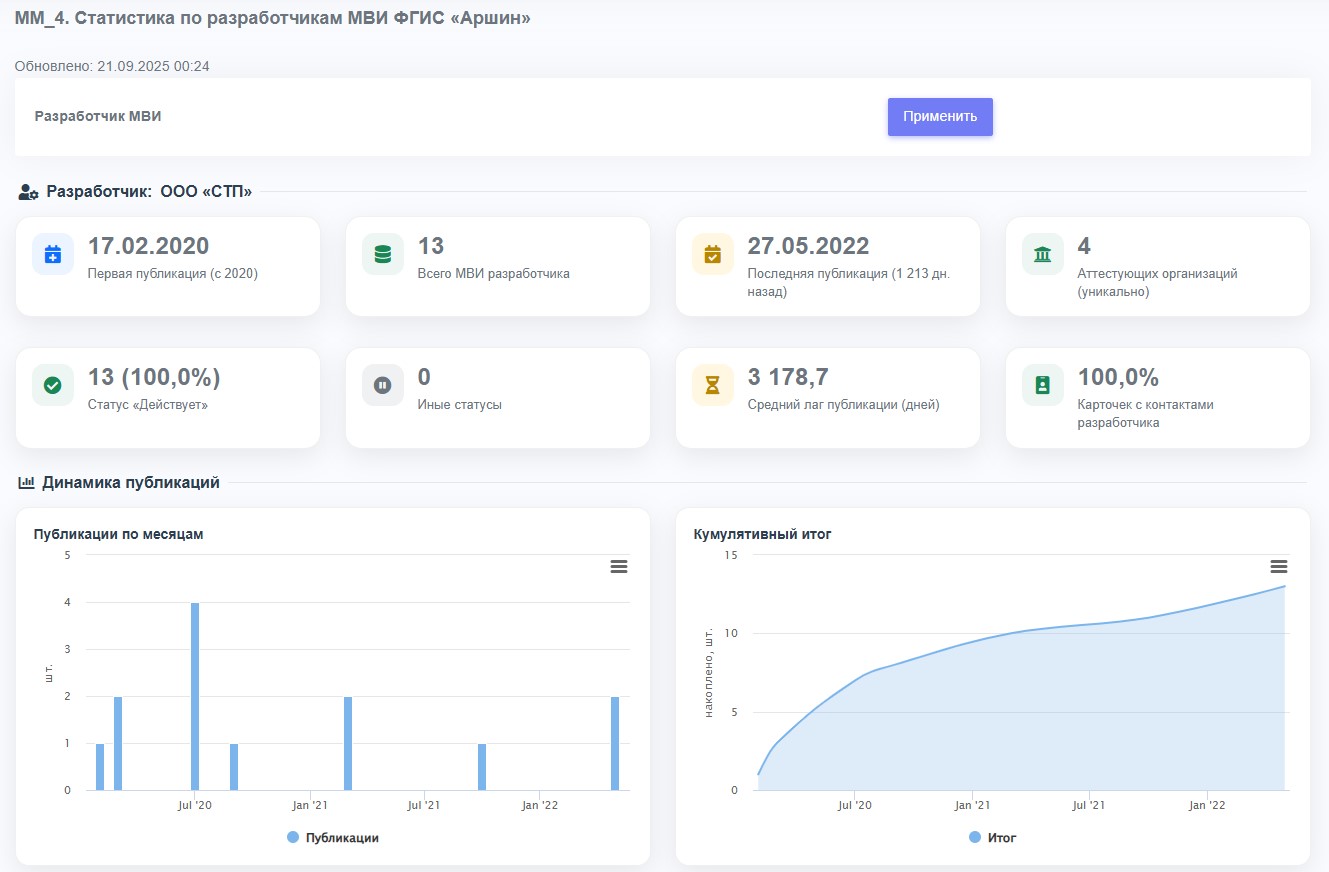 Отчёт «MM_4. Статистика по разработчикам МВИ ФГИС «Аршин»» фокусируется на деятельности отдельного разработчика с 2020 года. После выбора разработчика в выпадающем списке рассчитываются ключевые показатели: первая и последняя публикации, общее число МВИ, доля статуса «Действует», количество задействованных аттестующих организаций и средний лаг от даты свидетельства до публикации.