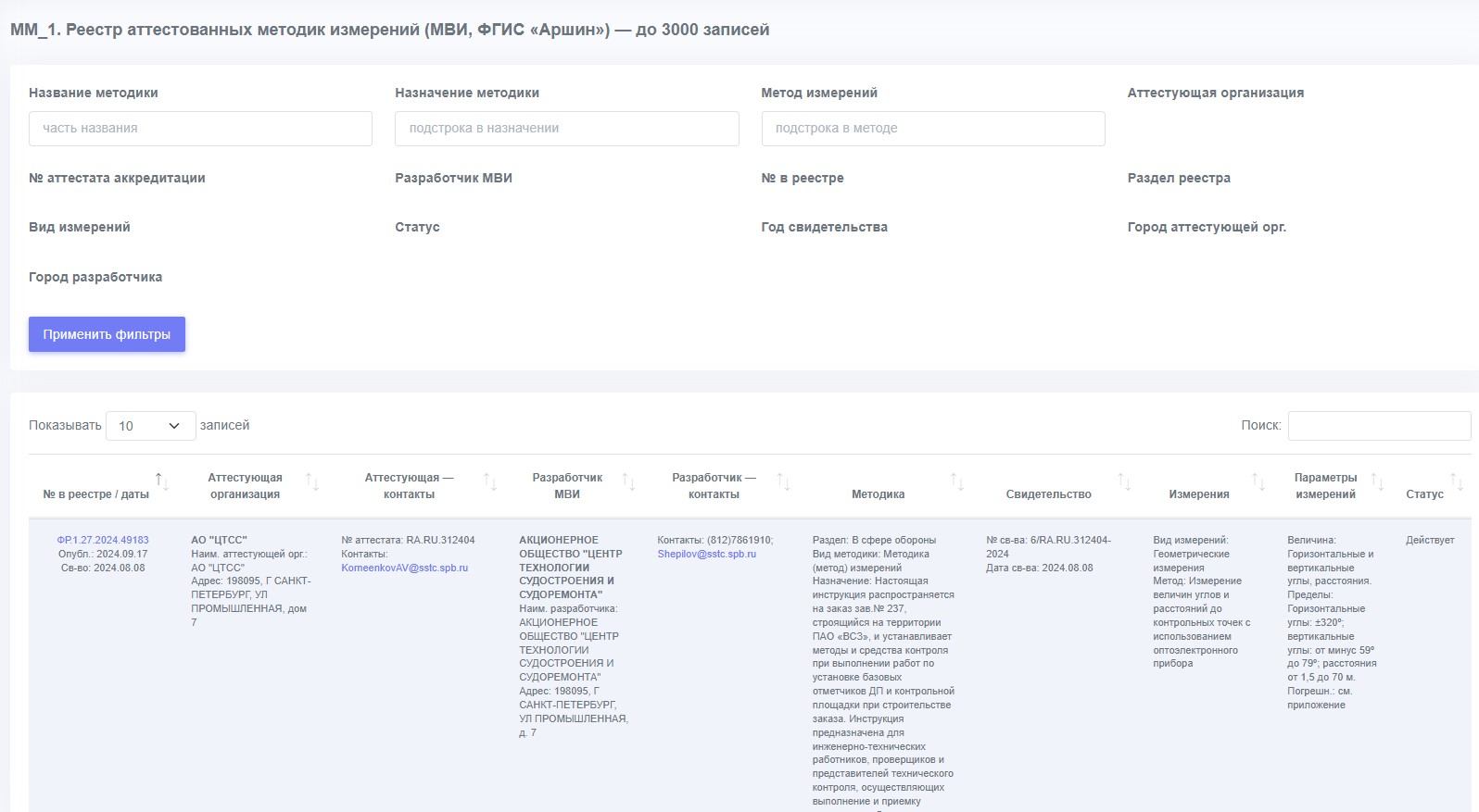 В таблице клик по номеру в реестре открывает карточку на сайте ФГИС «Аршин». Контактные поля (телефон, e-mail) отображаются при наличии, что упрощает коммуникацию с участниками. Если нужная запись не попала в текущую выборку (из-за лимита строк), уточните фильтры или измените условия отбора — список обновится мгновенно.