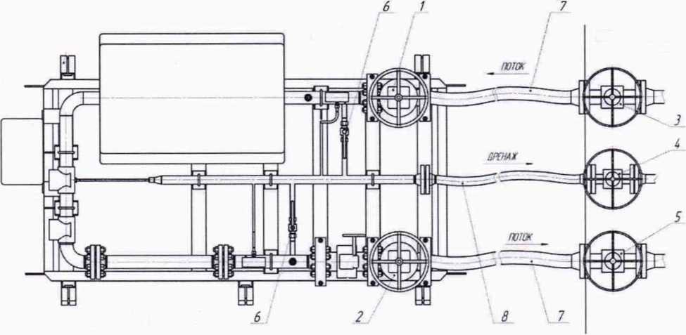 7.1.3.2 Подключают технологические трубопроводы ППУ посредством гибких рукавов 7 и 8 с эталоном, в фланцевых соединениях применяют уплотнительные прокладки, соответствующие типу уплотнительной поверхности фланцев.