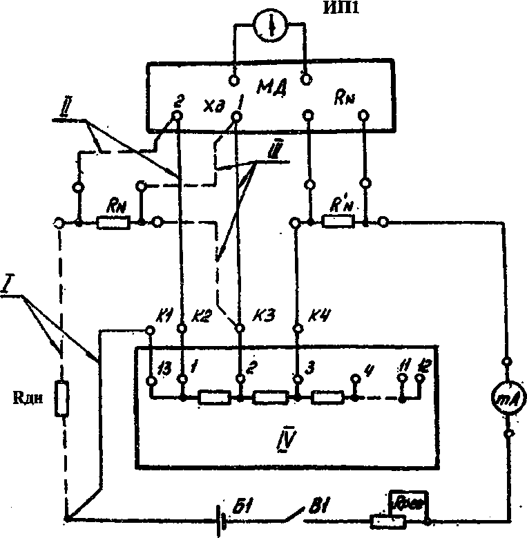МД - двойной мост класса 0,05; ИП1 - гальванометр (Rr < 20 И, Ci^l ,3 • 10'9А/дел); ИП2 - миллиамперметр; Иди - измеряемое сопротивление; RN - образцовая мера (катушка) сопротивления; RN. -катушка сопротивления рабочая; Rp - регулировочное сопротивление; Б1 -источник питания; В1 - выключатель; KI...К4 - контакты поверочной щетки ММЭС; I, II, Ш - соединительные провода; IV - поверяемая декада прибора.