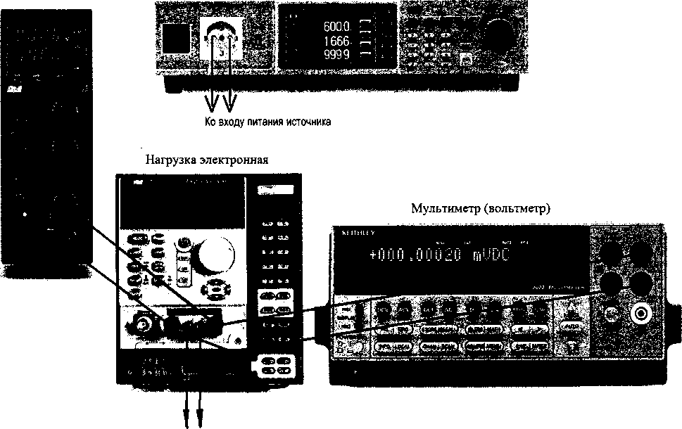7.6.1 Разъемы поверяемого источника питания соединить при помощи измерительных проводов с соответствующими разъемами нагрузки электронной АКИП-1303 и мультиметра цифрового 2002 согласно руководству по эксплуатации по схеме, приведенной на рисунке 1.