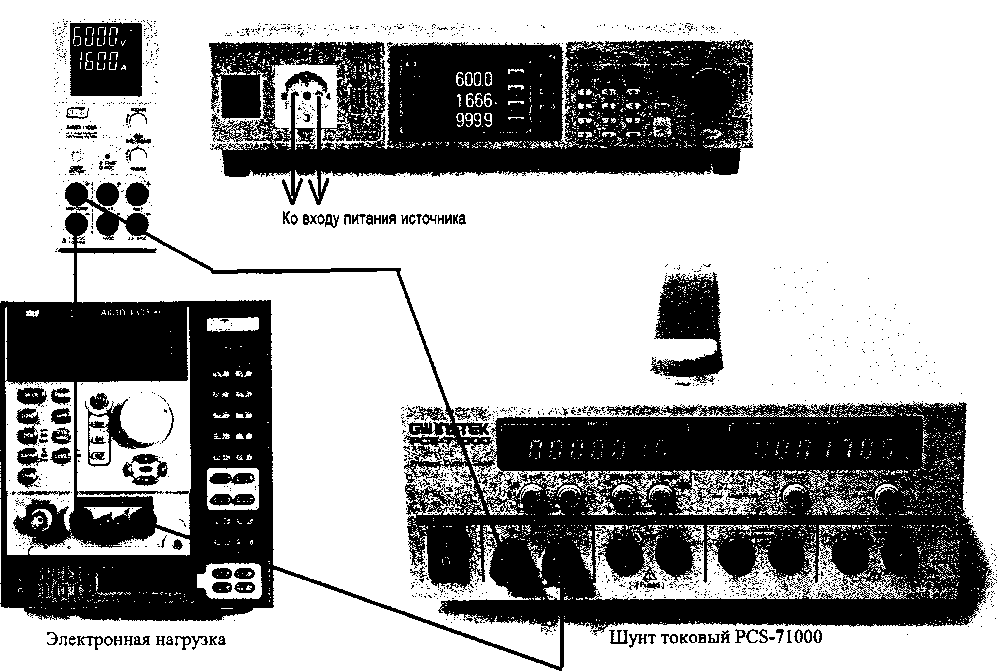 7.8.1 Разъемы поверяемого источника питания соединить при помощи измерительных проводов с соответствующими разъемами нагрузки электронной АКИП-1303, шунта токового PCS-71000 по схеме на рисунке 3.