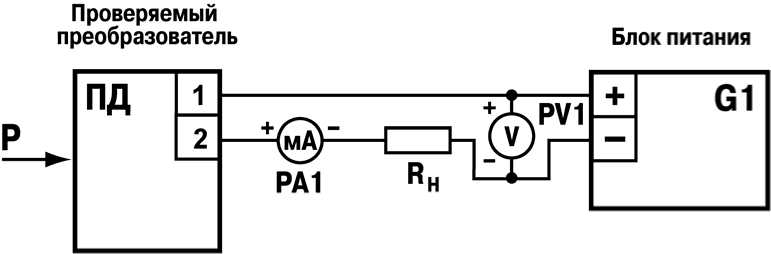 Схема А.1 (электрическая) - Включение преобразователя давления с аналоговым выходным сигналом постоянного тока 4-20 мА (при измерении выходного сигнала миллиамперметром)