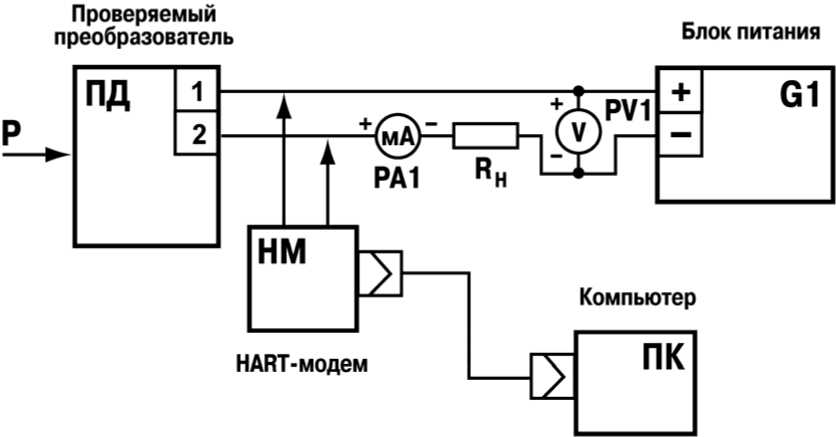 Схема А.2 (электрическая) - Включение преобразователя давления с аналоговым выходным сигналом постоянного тока 4-20 мА и цифровым выходным сигналом на базе протокола HART (при считывании информации по цифровому каналу и миллиамперметру), НМ - HART-модем