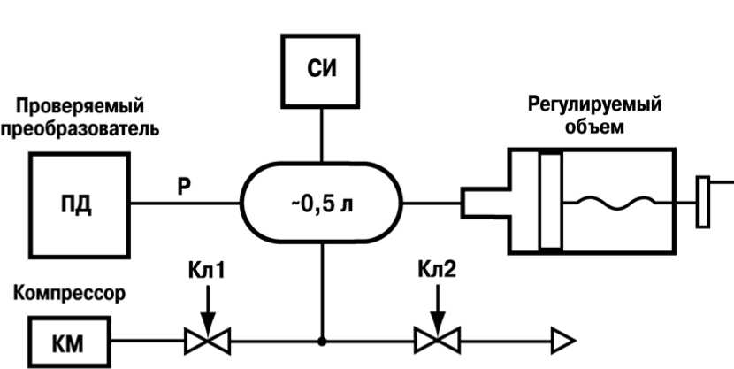 Схема А.4 (пневматическая) - Подключение для поверки преобразователя избыточного давления и разности давлений, СИ - эталонное средство для измерения давления или разрежения (см. таблицу 2); Кл1, Кл2 - клапаны запорные (краны-натекатели); КМ - компрессор
