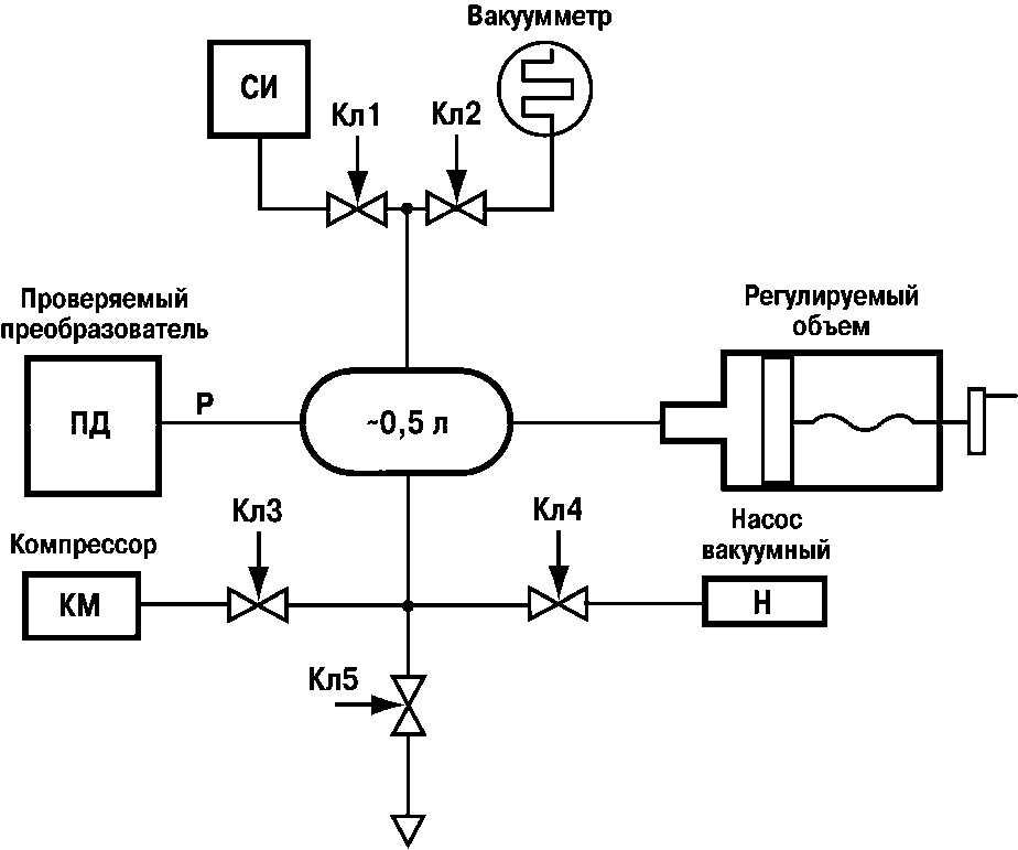 Схема А. 5 (пневматическая) - подключение для поверки преобразователя абсолютного давления и разрежения, Кл1-Кл5 - клапаны запорные (краны-натекатели); КМ - компрессор (задатчик давления, см. таблицу 2); Н - насос вакуумный (например, задатчик вакуумметрического давления «Воздух-0,4В»);