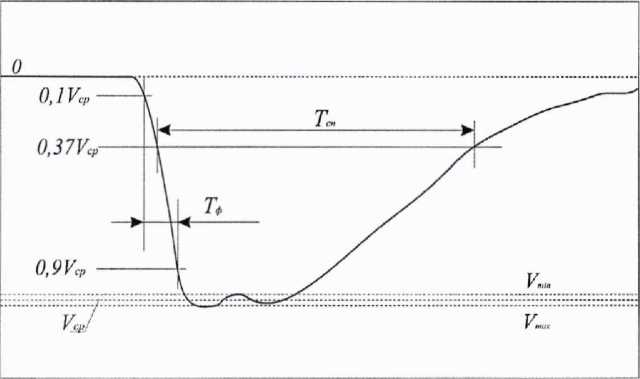 По полученной осциллограмме при помощи маркеров осциллографа определяют установившееся (среднее) значение амплитуды импульса напряжения Vcp, В (см. рисунок 2) и определяют постоянную времени спада Tcnj, мкс, i=l, по уровню 0,37 от установившегося значения амплитуды импульса напряжения на выходе преобразователя