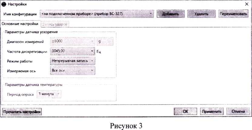 7.2.2 Нажать кнопку «ОК» в появившемся окне, в окне «Настройки» выбрать значения в соответствии с рисунком 3 (все оси, непрерывная запись, максимально возможная для этою режима частота дискретизации), и нажать кнопку «ОК».