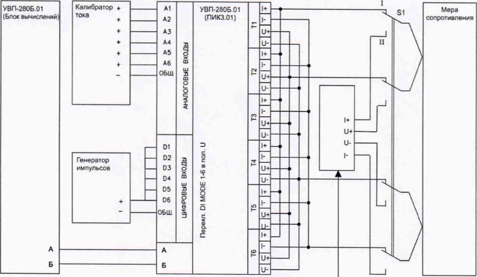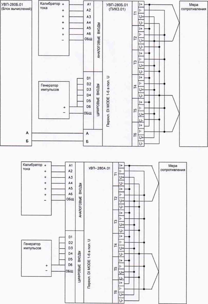 При поверке вычислителей УВП-280Б.01, включающих два и более блоков ПИК3.01 блоки ПИК3.01 подключают к блоку вычислений по одному поочередно в соответствии со схемами поверки Приложения 1. При поверке вычислителей УВП-280Б.01 номер проверяемого блока ПИК3.01 устанавливают равным 1 (порядок установки номера ПИК3.01 приведен в РЭ). При поверке вычислителя УВП-280Б.01 без блоков ПИК3.01 собирать схему не требуется.