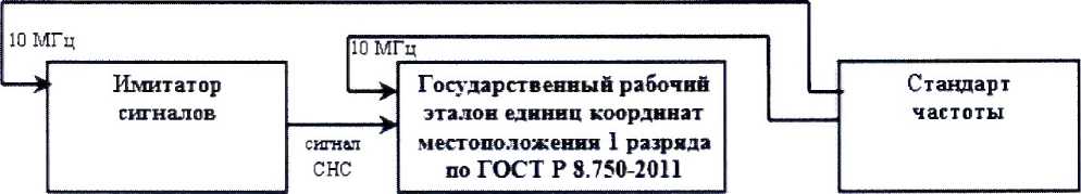 Для подключения государственного рабочего эталона единиц координат местоположения 1 разряда по ГОСТ Р 8.750-2011 использовать разъем RF Out на передней панели корпуса поверяемого имитатора сигналов. К имитатору сигналов подключить эталонный приемник навигационного сигнала (далее - приемник) из состава государственного рабочего эталона единиц координат местоположения 1 разряда по ГОСТ Р 8.750-2011.