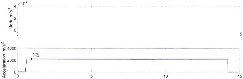 б) рывок со значением 22000 м/с3 в течение 0,61 с, при этом значение ускорения достигает 2200 м/с2;