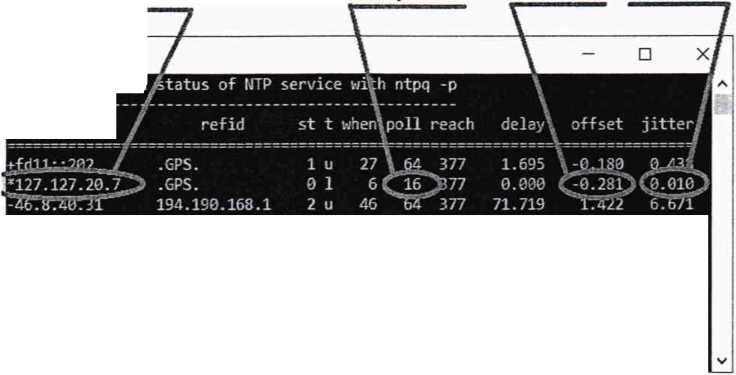 На рабочем столе комплекса выбрать пиктограмму «Статус NTP». В появившемся тексте (Рисунок 2) следует найти строку, начинающуюся со знака * либо %, и зафиксировать величины offset (текущее значение смещения в миллисекундах относительно шкалы времени NTP-источника), и jitter (среднеквадратичное отклонение в миллисекундах значений смещения при периодической подстройке).