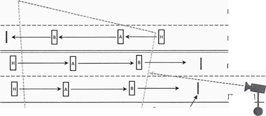 Нумерация полос осуществляется слева направо в кадре камеры. Тестовому автомобилю подъехать к зоне контроля таким образом, чтобы его пластина номера оказалась в положении «Н» на полосе 1 (пластины не должно быть видно в кадре). На дальномере, установленном на автомобиле (снаружи на дверь либо на стекло двери) неподвижно, включить режим постоянного свечения луча. Дальномер установить строго горизонтально (по встроенному инклинометру) и вдоль курса движения. Оператору установить штатив со светоотражающей панелью в указанном на схеме месте так, чтобы точка луча дальномера оказалась в центре светоотражающей пластины. Автомобиль плавно переместить своей пластиной номера в точку «А» (ориентировочно 30% высоты кадра от верхней границы кадра). При выборе точки «А» следует учитывать, что в том месте кадра комплекс уже должен надежно распознавать пластину номера ГРЗ. Остановить автомобиль на 3-5 секунд, на дальномере (и в ПО поверки кнопкой «А») активировать первое измерение. Затем автомобиль плавно «по лучу» переместить пластиной в точку «В» (не менее 10 м от точки «А»), остановить на 3-5 секунд, и на дальномере (а также в ПО поверки кнопкой «В») активировать второе измерение. Затем автомобиль вывести из кадра. Измерения дальномера записать, а светоотражающую панель со штативом убрать в тестовый автомобиль, и измерение повторить по полосе 2. По третьей полосе порядок проезда аналогичный, но использовать заднюю пластину номера. При перемещении по полосе 3 из положения «Н» в положение «А» следить за тем, чтобы пластина номера оказалась в кадре целиком как по высоте, так и по ширине.