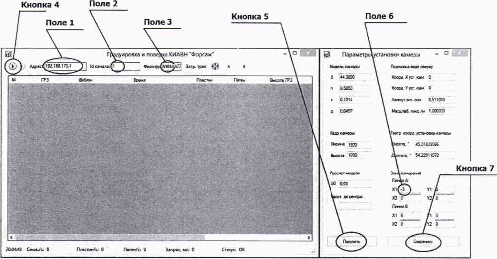 Включить получение данных из комплекса кнопкой 4. Получить из комплекса параметры установки камеры (кнопка 5). В параметр XI линии А (поле 6) ввести значение «-3». Сохранить настройки кнопкой 7.
