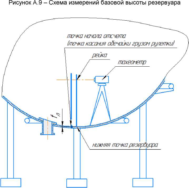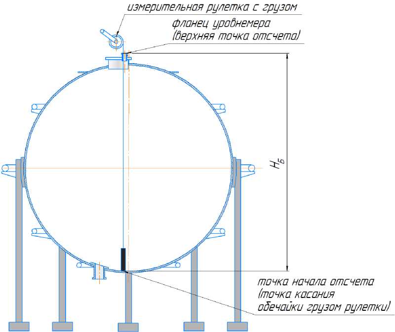 3.15 точка начала отсчета: Точка в нижней части обечайки резервуара, которой касается груз измерительной рулетки при измерении базовой высоты резервуара и от которой проводят измерение уровня жидких углеводородных сред при эксплуатации резервуара. Она является исходной точкой при составлении градуировочной таблицы резервуара.