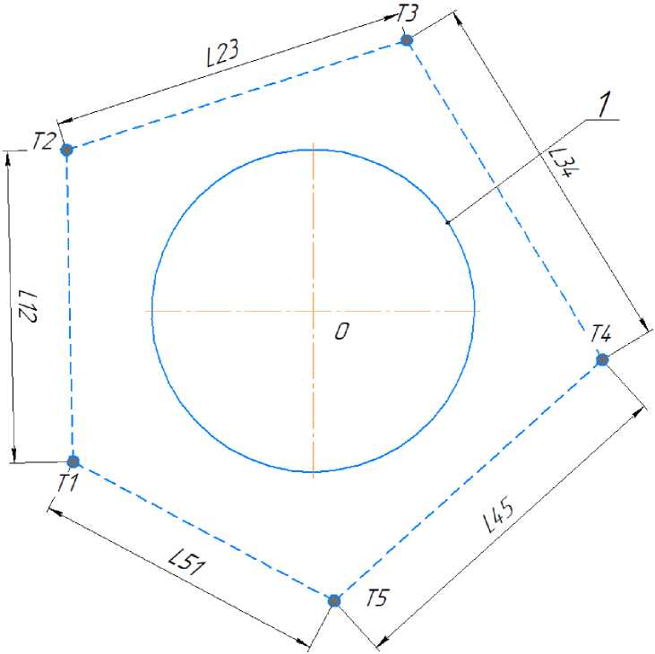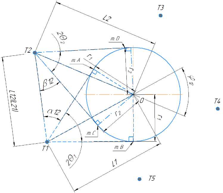 4.2 Определяют диаметр резервуара по его экватору (рисунок А.2) по результатам угловых измерений координат опорных точек, расположенных на касательной вертикальной плоскости и линейных расстояний между станциями съемки.