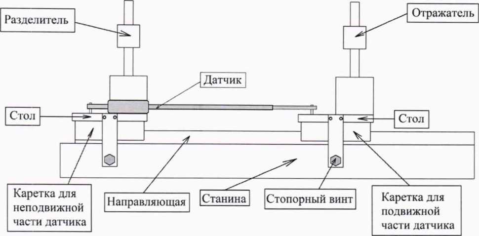 6.3.1.8 Установить комплект оптических элементов для измерений линейных перемещений таким образом, чтобы отражатель был установлен на столе, где закреплена подвижная часть датчика, а разделитель на столе где закреплена неподвижная часть датчика.