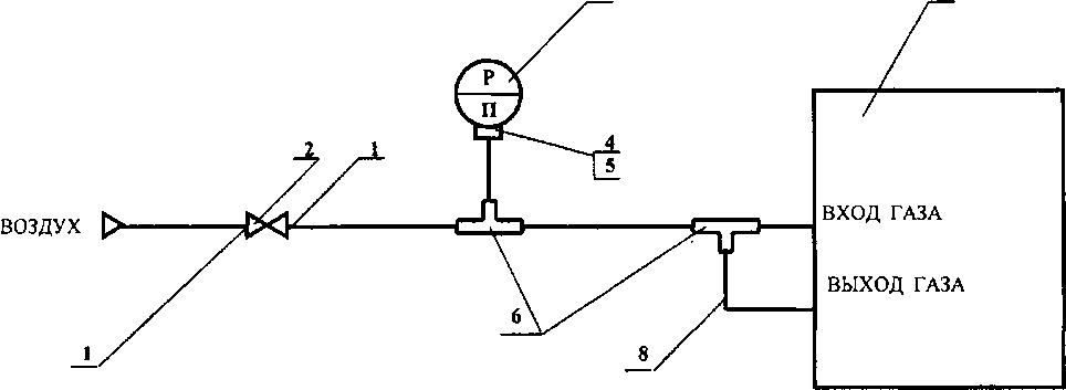 5.2 Проверка герметичности газоанализатора производится при отключенном электрическом питании по схеме рисунка 1. Испытания проводятся на сжатом воздухе, техническом азоте или на ПГС.