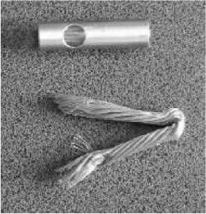 Провод следует перегнуть так, чтобы в место изгиба попал неповрежденный участок провода, и вставить его обратно в трубку. Убедившись, что в отверстии трубки виден участок провода, достаточный для хорошего прижима, вставить трубку в корпус электроконтакта так, чтобы отверстие трубки располагалось напротив фиксирующего винта, и затянуть винт.