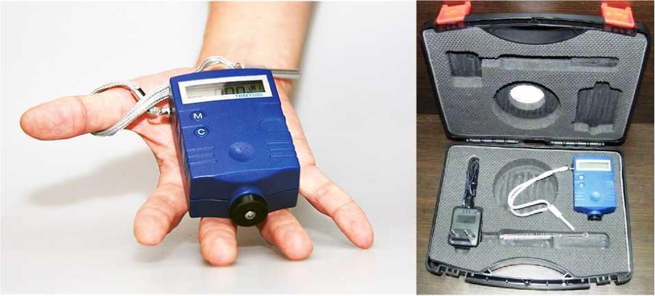 6.2.3. Установка датчика - держась за нижний край твердомера (между большим и указательным пальцами) плотно прижмите опорное кольцо твердомера перпендикулярно к измеряемой поверхности.