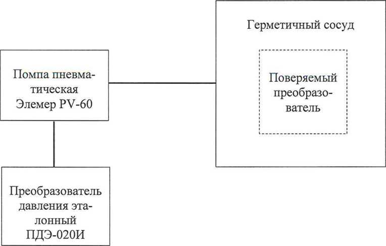 Создают давление равное верхнему пределу измерений поверяемого преобразователя и отключают источник давления (в качестве источника давления могут использоваться грузопоршневые манометры МП-6 или МП-60, манометр абсолютного давления МПАК-15, а также помпа пневматическая PV-60, в зависимости от значения испытательного давления и способа проверки преобразователей). Если в качестве эталона применяется грузопоршневой манометр, его колонку и пресс также отключают.