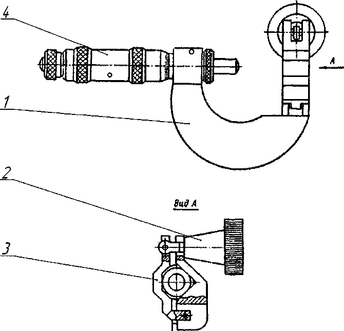 Погрешность микрометров с верхним пределом измерения более 100 мм допускается определять с помощью дополнительного приспособления (приложение А), которое закрепляют на скобе микрометра. Регулируемая пятка приспособления и микрометрический винт микрометра должны быть соосны.