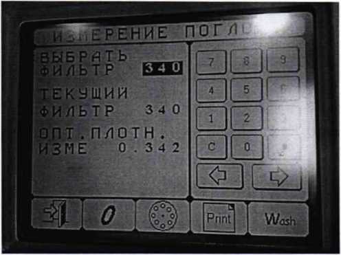 * Перед проведением измерений оптической плотности каждой меры из комплекта мер оптической плотности КМОП-Н необходимо выполнить промывку анализатора (функционирует в главном меню и режиме измерения поглощения; клавишу «Wash» удерживать от 7 до 10 секунд) и установку нуля по воде (п.п. Б. 1.3.3 - Б. 1.3.4).