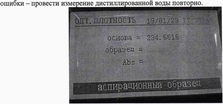 Б.2.1.3 Поднести к заборной трубке анализатора емкость с дистиллированной водой и нажать кнопку забора образца. Затем, после забора жидкости, прозвучит звуковой сигнал и на экране появится надпись; извлечь трубку. В случае корректного измерения нуля по дистиллированной воде, анализатор должен перейти в меню измерения метода; при появлении