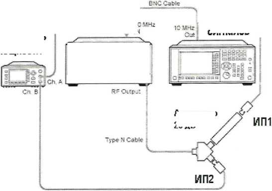 8.7.9 Отсоединить ИП1 от делителя. Освободившийся рукав делителя соединить с анализатором спектра (рисунок 7). На анализаторе установить DC coupled, предусилитель выключен, полоса обзора 1 МГц, ослабление аттенюатора 10 дБ. Произвести измерения уровня сигнала уровня -10 дБ/мВт на частотах 3,65*109, 5,05*109, 6,05*10 , 7,05*109. 8,05*109, 8,35*109, 9,05*109, 10,05*109, 11,05*109, 12,05*109, 13,05-109, 13,55*109, 14,05*109, 15,05-Ю9, 16.05Н09, 17,05*109, 18,05*109, 19,05*109, 20,05*109, 21,05*109, 22,05*109, 23,05*109, 24,05*109, 25,55*109, 26,05*109, 26,45*109, 30,05*109, 32,05*109, 35,05*109, 37,05*109, 40,05*109, 43*109, 44*109 (в зависимости от типа анализатора спектра ) Гц. Полученные значения зафиксировать, вычислить погрешность.