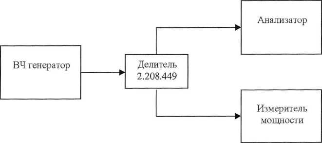 7.3.3.1 Соединить ВЧ генератор, делитель мощности, измеритель мощности МЗ-51 и анализатор, как показано на рисунке 3. Если проверяется опция 01 с включенным предусилителем, то ко входу анализатора подсоединяется внешний аттенюатор 30 дБ.