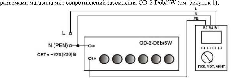 - входные разъемы поверяемого измерителя, предназначенные для подключения измерителя в режиме измерения электрического сопротивления заземления без срабатывания УЗО, соединить при помощи измерительных проводов с разъемами магазина мер сопротивлений заземления OD-2-D6b/5W (см. рисунок 1);