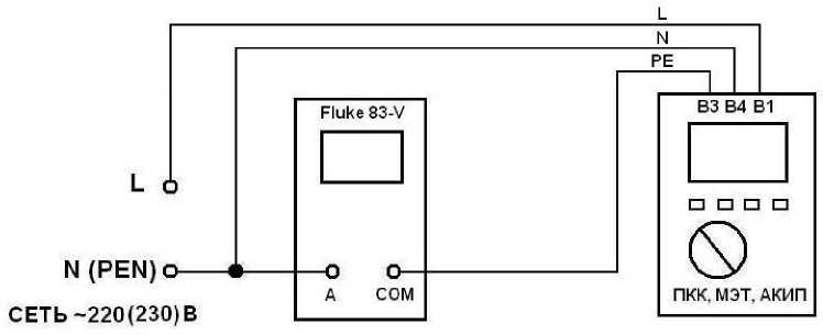 - входные разъемы поверяемого измерителя, предназначенные для подключения измерителя в режиме измерения действующего значения тока отключения УЗО, соединить при помощи измерительных проводов с разъемами мультиметра цифрового Fluke 83-V (см. рисунок 2);