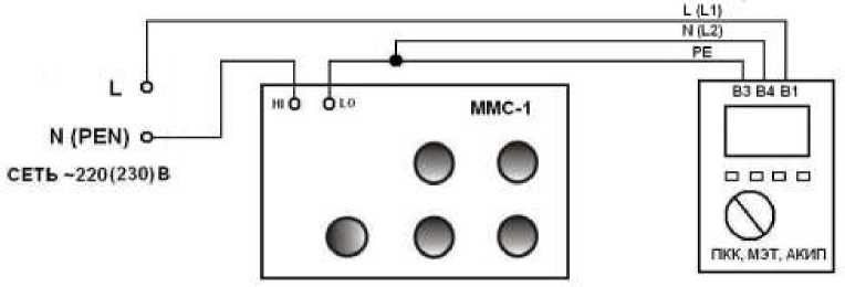 Рисунок 3 - Структурная схема соединения приборов при определении абсолютной погрешности измерения электрического сопротивления цепи «фаза-фаза», «фаза-нейтраль», петли «фаза-земля».