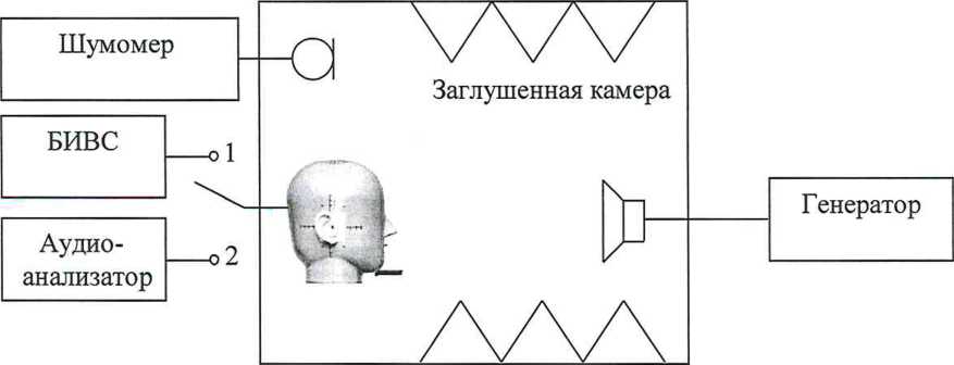 8.2.2 Собрать схему, приведенную на рисунке 1 (мембрана громкоговорителя расположена перпендикулярно к передней части манекена, соосно на расстоянии 1 м от центра искусственных ушей).