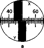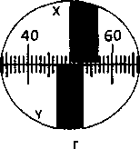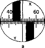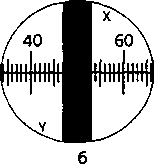 — смещают изображение струны в одной из плоскостей вправо (рисунок 1г) или влево (рисунок 1в), до совмещения края струны с центральной вертикальной риской, поворачивая соответствующий барабан. Производят отсчет показаний. Затем, смещают изображение в противоположную сторону до совмещения другого края с центральной вертикальной риской. Производят отсчет показаний и вычисляют среднее значение, соответствующее середине струны, восстанавливают положение струны (рисунок 16);