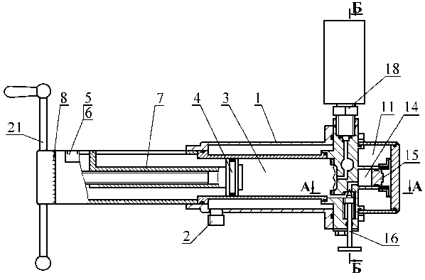 4.1.2. Узел пресса имеет поршень (4), винтовую пару (7), рукоятку (21), лимб (8), две линейные шкалы, одна из которых (5) показывает текущий объем измерительной камеры, а другая (6) соотношение объемов газовой и жидкой фаз в ней.