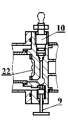 4.1.1. Измерительный блок включает в себя: корпус (1), служащий термо-статирующей рубашкой и снабженный двумя штуцерами (2, 17) для подключения к трубопроводу; пробоотборную камеру (3) с дозировочным отсеком (14); заполненный жидкостью манометрический узел (18), снабженный эластичным разделителем (22) и компенсационным поршнем (19); пробоотборный (9) и перепускной (16) вентили, а также кран (10).