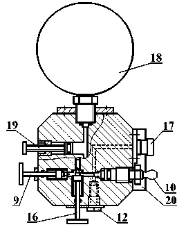 7.1.4. Закрыть вентиль (9), отвести поршень (4) в положение, соответствующее требуемому соотношению фаз, открыть вентиль (16), при этом нефть, турбулизируясь, перейдет из дозировочного отсека (14) в пробоотборную камеру (3), и снять показание давления по манометру (18).