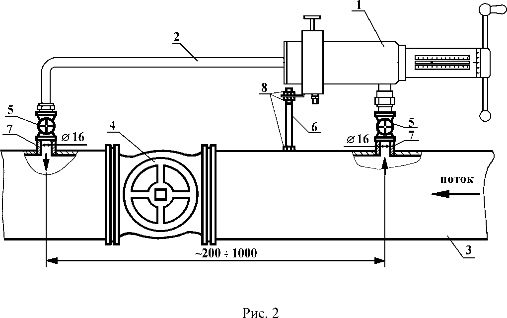 6.2.1. В промысловых условиях, для подключения прибора к трубопроводу, необходимо до и после секущей задвижки (см. рис. 2) врезать патрубки с пробоотборными кранами Dy 16, приварить гайку М 12 и ввернуть в нее шпильку.
