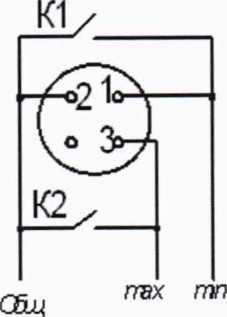 9.3. Погрешность и вариацию срабатывания сигнализирующего устройства определяют в трех точках шкалы, в следующем порядке: перед испытанием указатель нижнего предела сигнализации выводят на начальную отметку шкалы, затем указатель верхнего предела сигнализации устанавливают на одной из оцифрованных отметок в первой трети шкалы. Подключают дополнительное приспособление для проверки сигнализирующего устройства с нагрузкой 50 Вт в соответствии со схемой внешних электрических соединений, приведенной на рис.1.(в качестве дополнительного приспособления для проверки срабатывания сигнализирующего устройства используют мультиметр любого типа в режиме измерения сопротивления). После этого плавно повышают температуру до срабатывания сигнализирующего устройства.