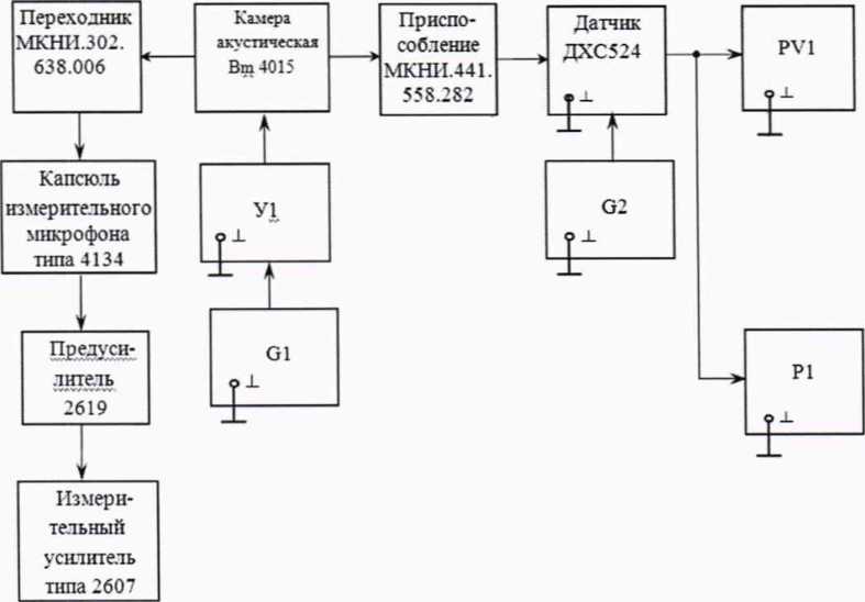 7.3.3 Задать при помощи генератора G1 и усилителя мощности У1 в акустической камере Вт 4015 на частоте 0,5FB (в зависимости от варианта исполнения датчика) звуковые давления 36; 63; 112; 200; 632; 2000 Па, контролируя их с помощью капсюля измерительного микрофона по измерительному усилителю.