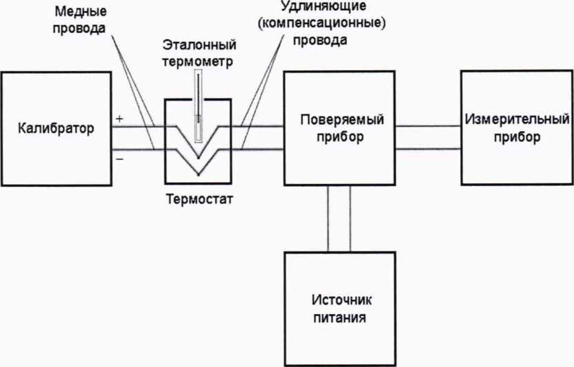 8.3.1 В приборе в соответствии с руководством по эксплуатации устанавливают тип НСХ и диапазон измерений в режиме работы с термоэлектрическими преобразователями. Собирают схему согласно рисунку 1.