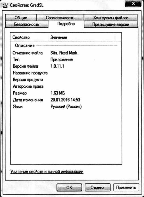 6.3.1.1. После запуска программы “GradSL” в верхней строке главного меню написано идентификационное название программы. В проводнике операционной системы в папке, где находятся файлы ПО “GradSL” выбрать исполняемый файл GradSL.exe и с помощью контекстного меню открыть раздел "Свойства". Во вкладке «Общие» приведено идентификационное название ПО “GradSL”; во вкладке «Подробно» приведен номер версии ПО “GradSL”. В полном номере версии ПО к метрологически значимой части относятся первые две цифры номера версии. Следующие за ними цифры, относятся к не метрологически значимой части ПО и могут принимать любые значения. Полный номер версии ПО должен соответствовать указанному в формуляре на поверяемый прибор. Копия примера окна идентификации приведена на рисунке 1.