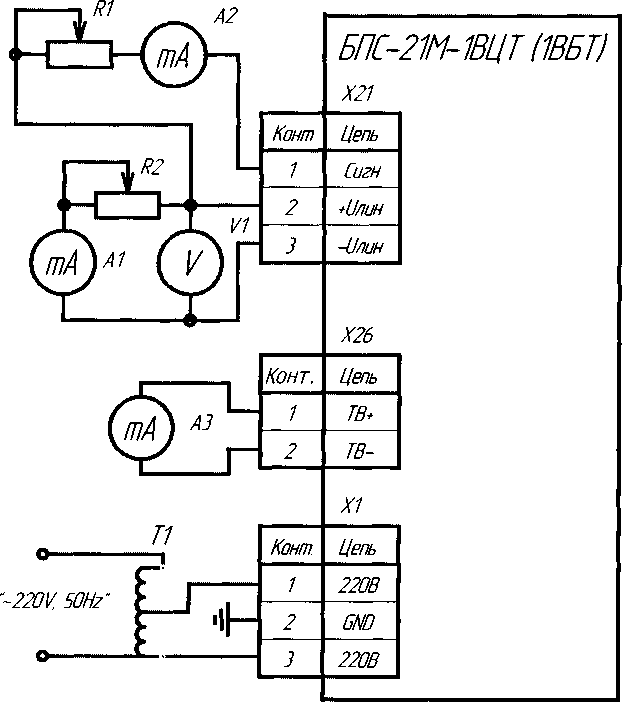 6.2.4.2 Проверку параметров искробезопасных цепей блока БПС-21М-1ВЦТ (1ВБТ) проводить следующим образом: