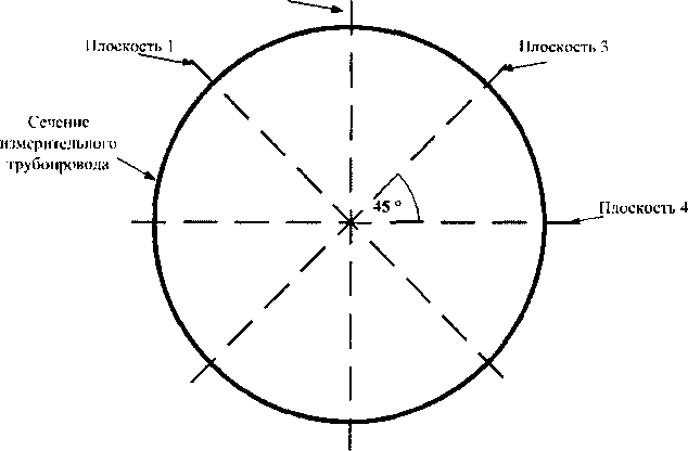 - в трех сечениях измерительного трубопровода: на месте установки двух УП и в середине участка измерительного трубопровода между двумя УП (рисунок 1) с помощью штангенциркуля измеряют наружный диаметр измерительного трубопровода в четырех равномерно распределенных друг от друга плоскостях (рисунок 1). В каждой из плоскостей провести три измерения. За результат измерений принять среднее арифметическое значение результатов 36 измерений диаметра (Dh, мм).