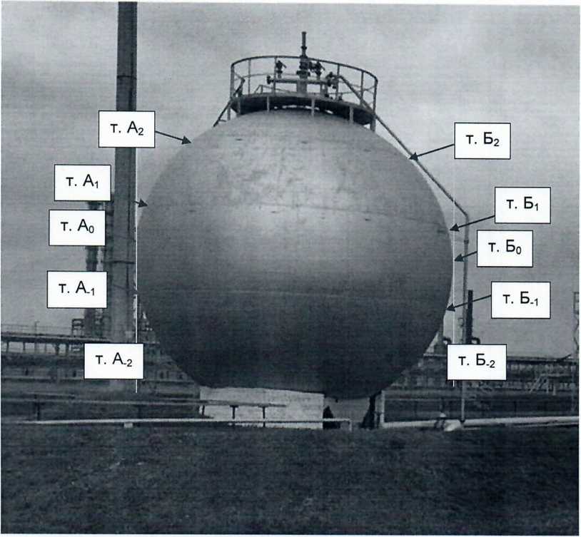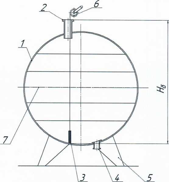 3.1 резервуар стальной сферический (шаровой): Стальной сосуд сферической формы наземного расположения, установленный на опорных стойках, оборудованный измерительным люком, приемо-раздаточными патрубками (рисунок А.1).