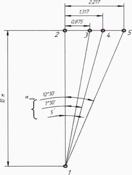 Поверка проводится на площадке размером не менее 15*6 м. На ней размечаются пять точек №№ 1-5 согласно рис.2 с обеспечением соблюдения указанных на рисунке расстояний, измеряемых с помощью дальномера GLM 250VF.