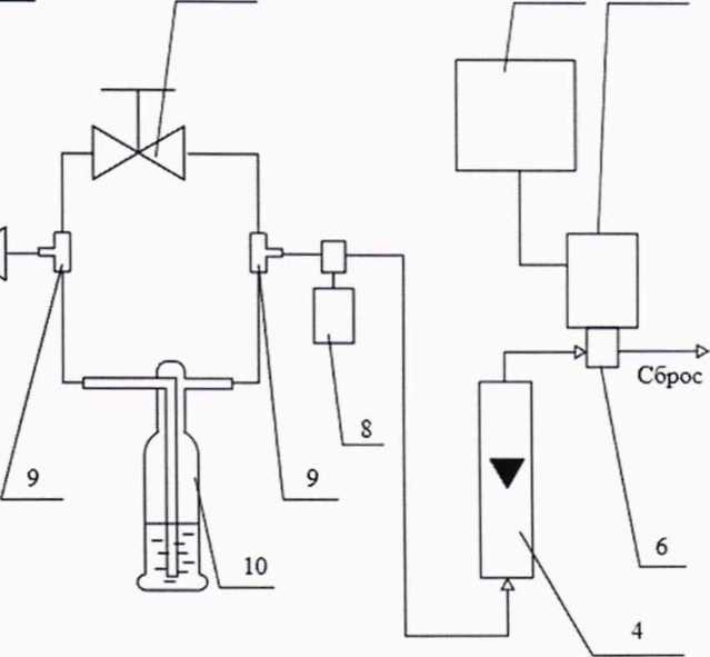 10 - склянка с насадкой СН объемом 200 см3, заполненная —100 см3 дистиллированной воды (допускается установка второй склянки с насадкой СН после первой в качестве каплеуловителя).