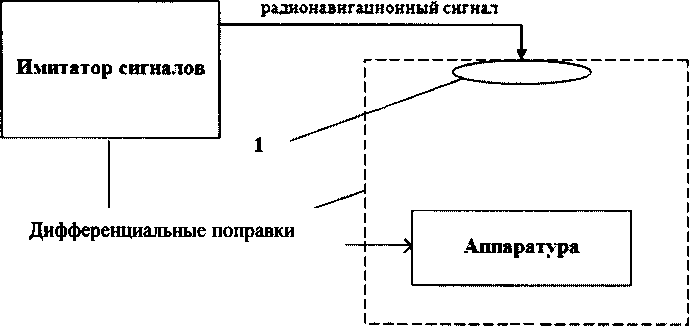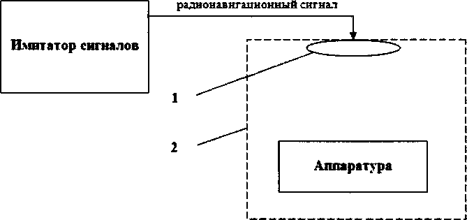 1 - переизлучающая антенна; 2 - экранированная камера (из состава имитатора сигналов) Рисунок 1 - Схема измерений