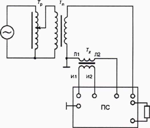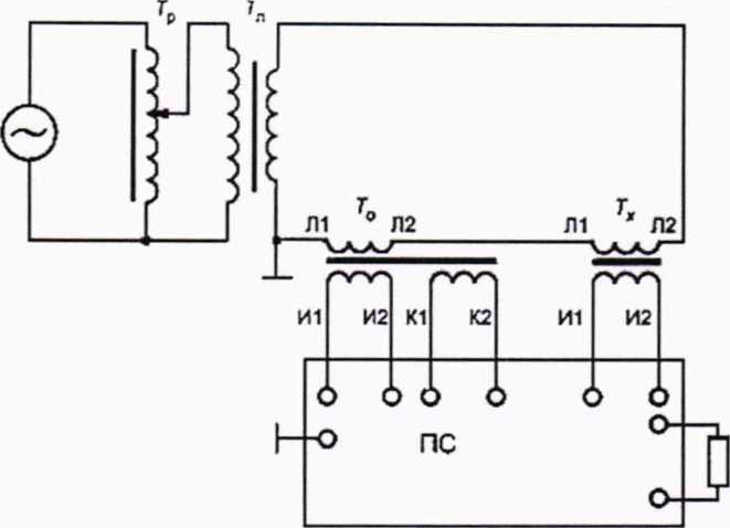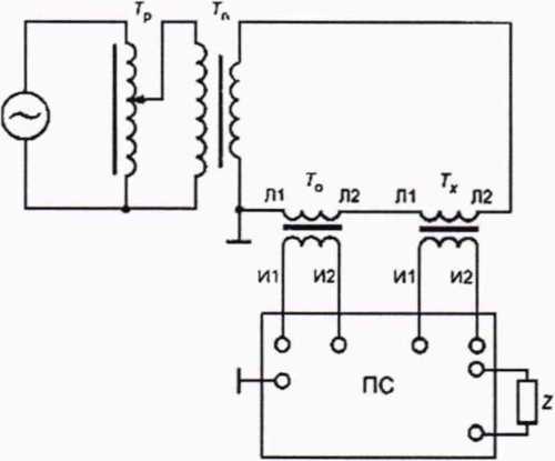 — сеть (генератор); Тр - регулирующее устройство (автотрансформатор); Тп - понижающий силовой трансформатор; То - рабочий эталон; Гх - поверяемый трансформатор тока; Лi, Л2 — контактные зажимы первичной обмотки: Hi, И2 - контактные зажимы вторичной обмотки;
